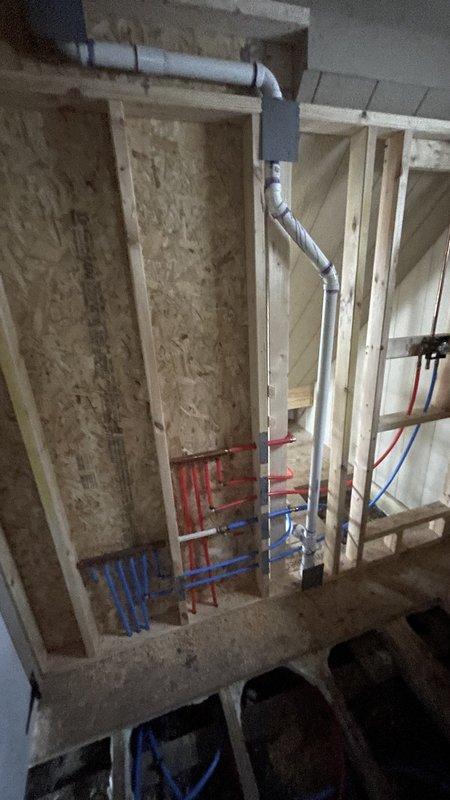 Completed rough-in plumbing installation for residential construction project, including proper placement and securing of PEX hot and cold water supply lines through wall framing cavities. Verified all piping configurations meet code requirements and documented installation with photos for inspection approval.