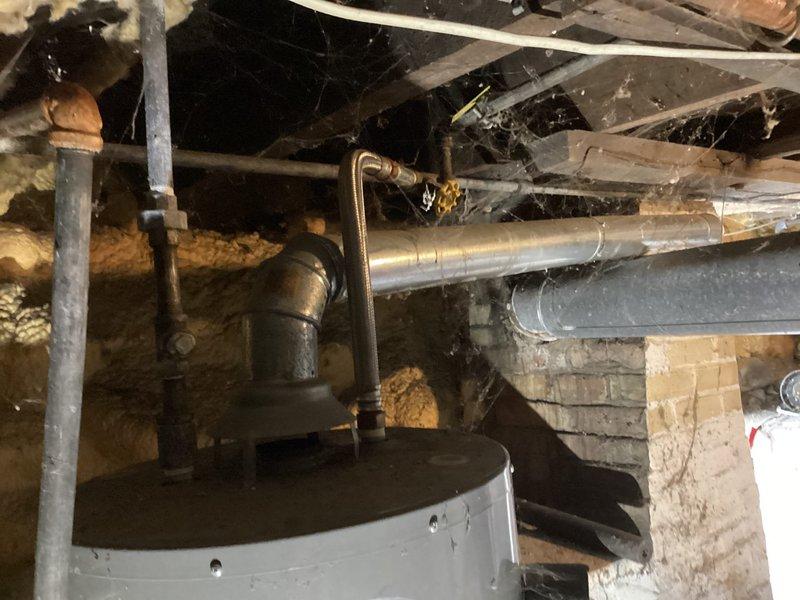 Diagnosed 12-year-old tanked water heater with inoperative burner. Inspection revealed significant dust and cobweb accumulation in the utility area around the unit and associated plumbing infrastructure. No water leakage detected.